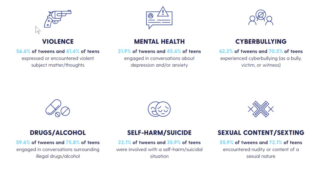 Need more proof? In a 2018 study conducted by Bark, analyzing 900 million messages across texts, email, social media and school-issued Google and Microsoft accounts of more than 2,600,000 children aged 8-17, they found: