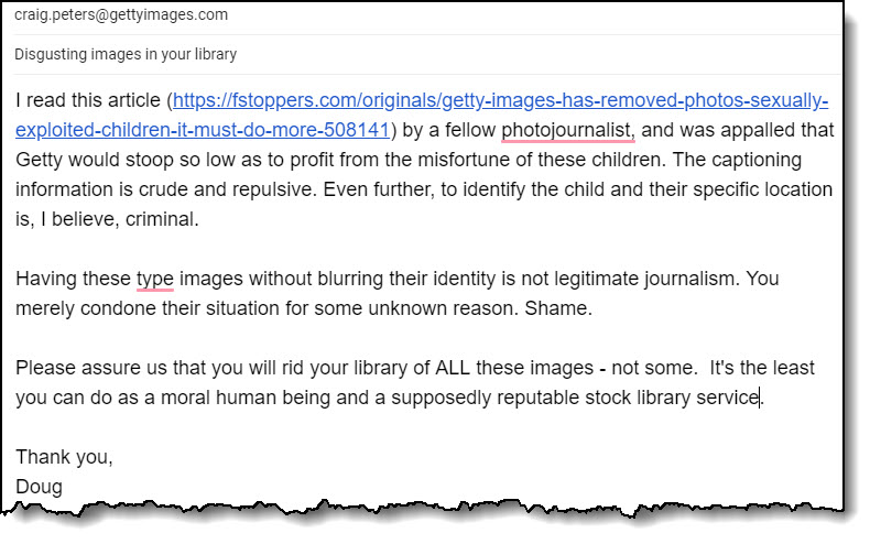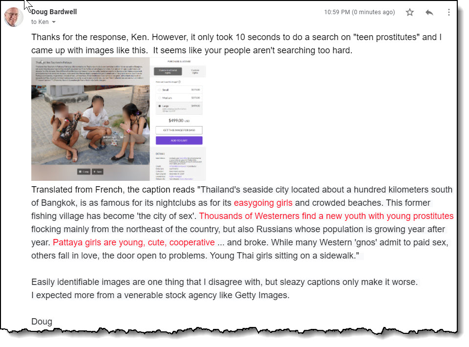 Please join me in writing Getty’s CEO, Craig Peters, and express our disgust at this lame effort to deflect from a moral responsibility to rid their archives entirely and to stop making a profit by selling these exploitive images. His email is craig.peters@gettyimages.com .